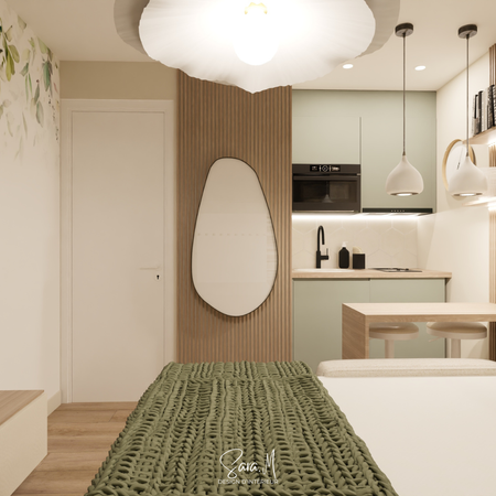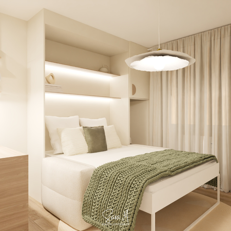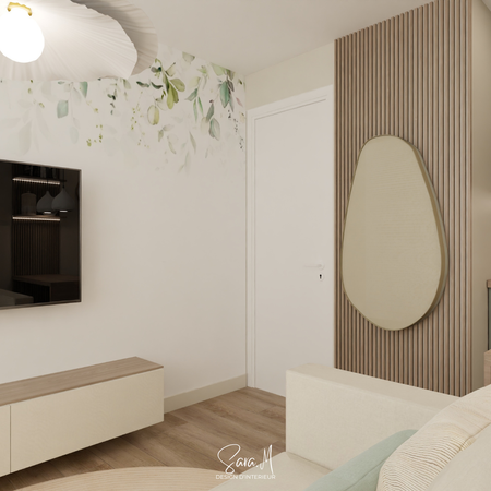 J'ai accompagné mon client de A à Z de la création d'ambiance à la conception des aménagements sur mesure. Une palette de couleurs douces a été privilégiée : vert sauge, teintes lin et bois naturel afin d'apporter chaleur, luminosité et sérénité à l'espace.