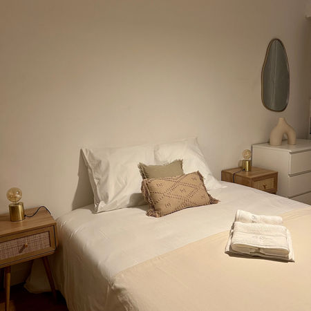 -Côté chambre, on a intégré un espace bureau pour le côté fonctionnel et des couleurs neutres pour une ambiance pleine de douceur.