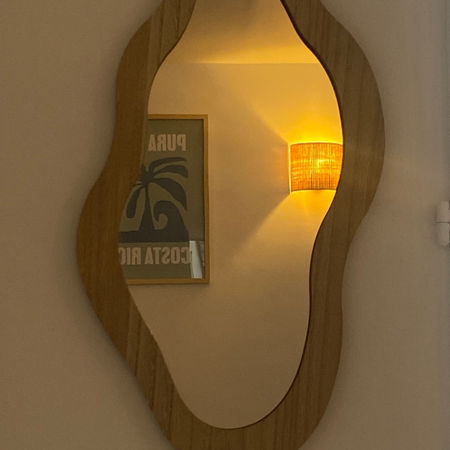 Pour apporter du peps à son studio, on a mis en valeur les espaces avec des arrondis de couleurs pastels ainsi que des accessoires déco : coussins, affiches. Etant donné qu’on devait conserver la table basse, j’ai ajouté de la texture avec des appliques murales en cannage, plaid, tapis et plantes pour donner vie au salon. Pour ajouter de la valeur à l’aspect locatif, nous avons intégré un canapé-lit pour le bien-être des locataires.